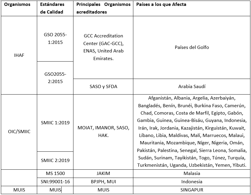 Los organismos representantes a nivel internacional para la regulación de la calidad halal son la SMIIC (Standards and Metrology Institute for the Islamic Countries) a través de la OIC (Organisation of Islamic Cooperation) y la IHAF (International Halal Acreditation Forum). El primer organismo SMIIC tiene sede en Turquía y regula el Halal a través de la normativa OIC/SMIIC 1:2019 para la comida Halal y la OIC/SMIIC 2:2019 para regular las certificadoras Halal entre otras. Mientras que el segundo IHAF, tiene sede en Dubai y regula el Halal a través de las normativas GSO, como por ejemplo la GSO 2055-1: 2015 para la comida Halal y la GSO 2055-2: 2015 para entidades certificadoras.